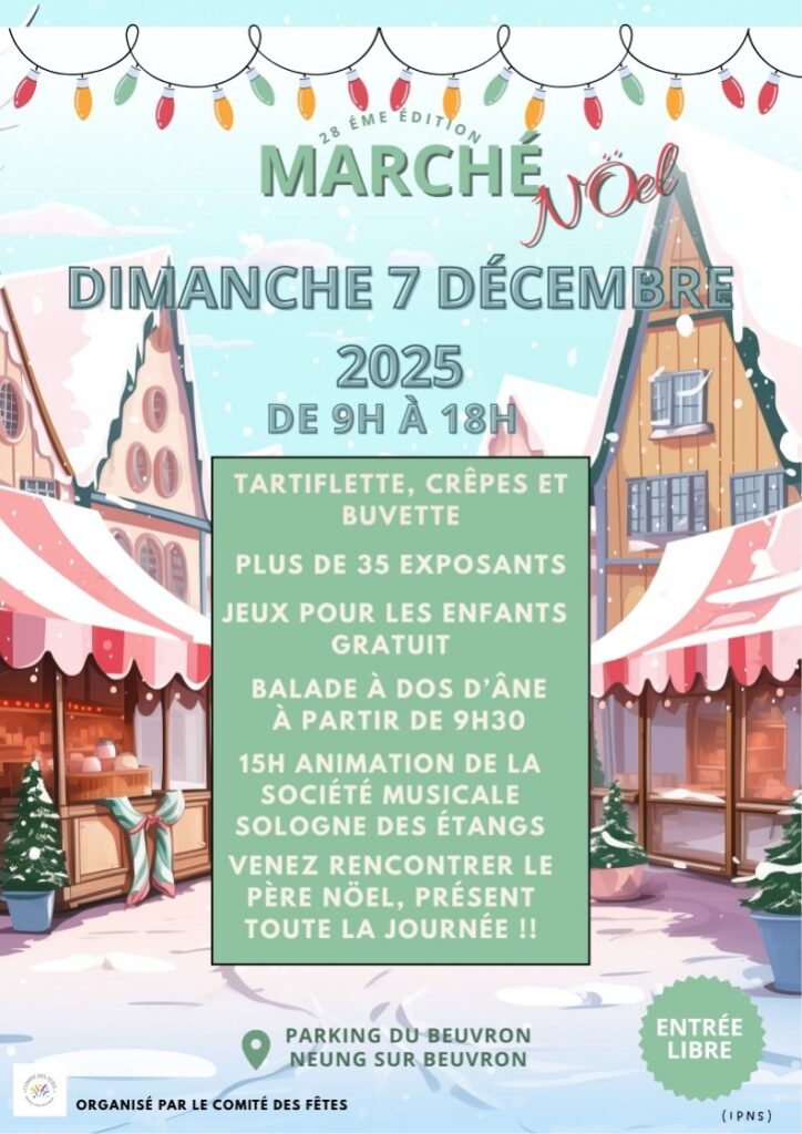 Venez découvrir notre Marché de Noël sur le parking du Beuvron dans une ambiance festive, chaleureuse et conviviale.